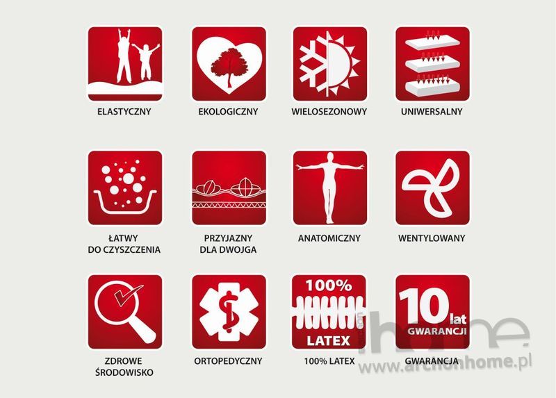 ZASTOSOWANIE: łóżka i sypialnie, gęstość lateksu 72kg/m3, waga użytkownika do 120 kg, materac dwustronny.
